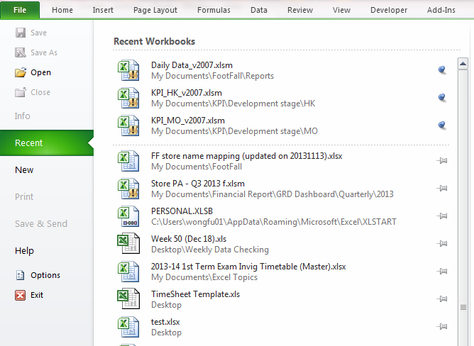 2) File Tab –> Recent (You can see the most recent files and their location)