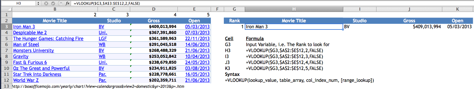 vertically lookup the value i want (i.e. the rank in G3), from the Table of the data source (i.e. A2:E12), then return the value of the Xth Column in the table as specified by the Col_Index_Num (2 for second column, i.e. Movie Title; 3 for 3rd column, i.e. Studio; etc), for an exact match is found (FALSE)