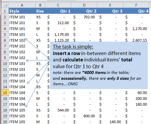 How to insert thousands of rows for each change in item in a column? And then give a subtotal of each item?