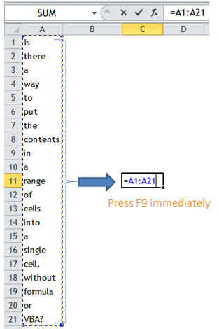 1. In any blank cell, input =A1:A21 Press F9 (do not press enter)