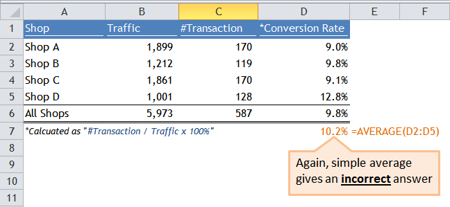 To get the correct answer, we have to find out the total number of Transactions, then divided it by total number of Traffic. Simple average would NOT give you the grand average for this kind of data. If the components (Traffic or Transaction) are missing, there is no way we can get the correct conversion rate for all shops.