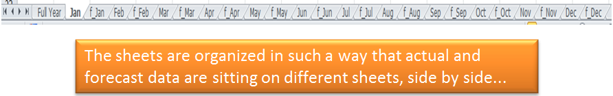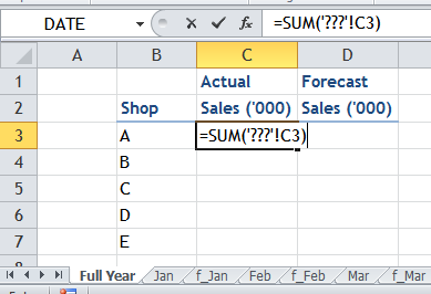 What you need to do is to add all actual numbers and forecast numbers in a summary table on the worksheet ‘Full Year’. There is no way for you to input the sheet reference easily. To tackle this, let’s try the followings: