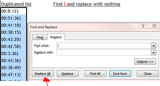 To do the rest with forumla instead of search and replace, you could then use MID to grab the time text without the parentheses. (e.g., =MID(C8,2,LEN(C8)-2)