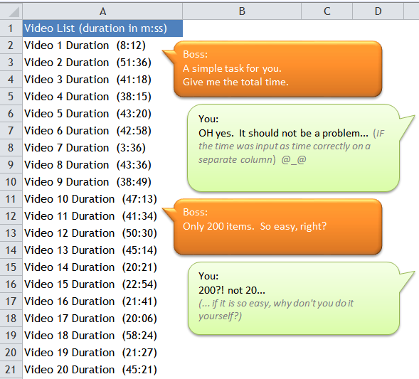3. To get total time we need to divide time values by 60 and sum them up as =SUMPRODUCT(B8:B27/60) or array-entered ={SUM(B8:B27/60)}