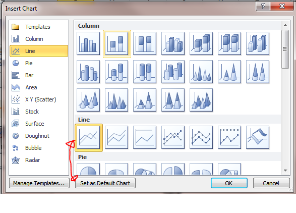 If you mainly use line chart, you may want to set line chart as your default chart type.