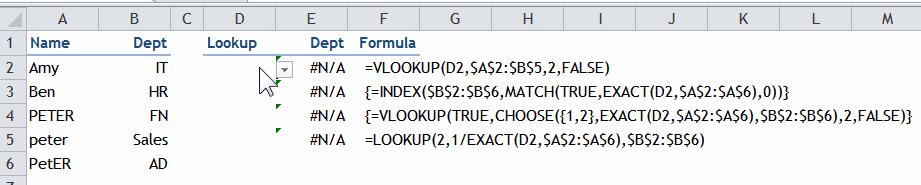 As you see from above, VLOOKUP always returns “FN” as a result for different “peter”s. Nevertheless, the formula in E3 to E6 manage to perform case-sensitive lookup correctly.  Then the question is HOW?