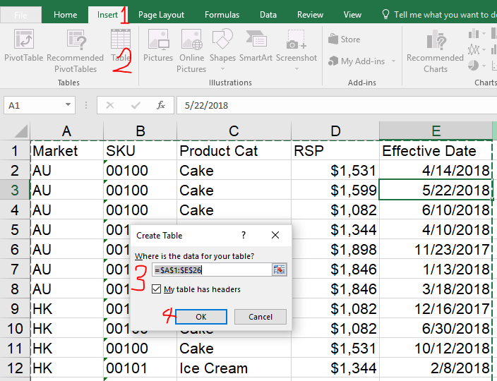 3. Confirm the data range; and tell Excel if “My table has headers”