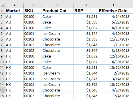 Remember, we are dealing with a big table with more than 80k rows of record.  The table needs to be updated on regular basis.  Every time we update the price of certain SKUs (quite a lot indeed), we want to retrieve updated information easily (and quickly, means in minute not hour) to show list of current / coming price with effective date by market.  It’s not an easy task with regular Excel.
