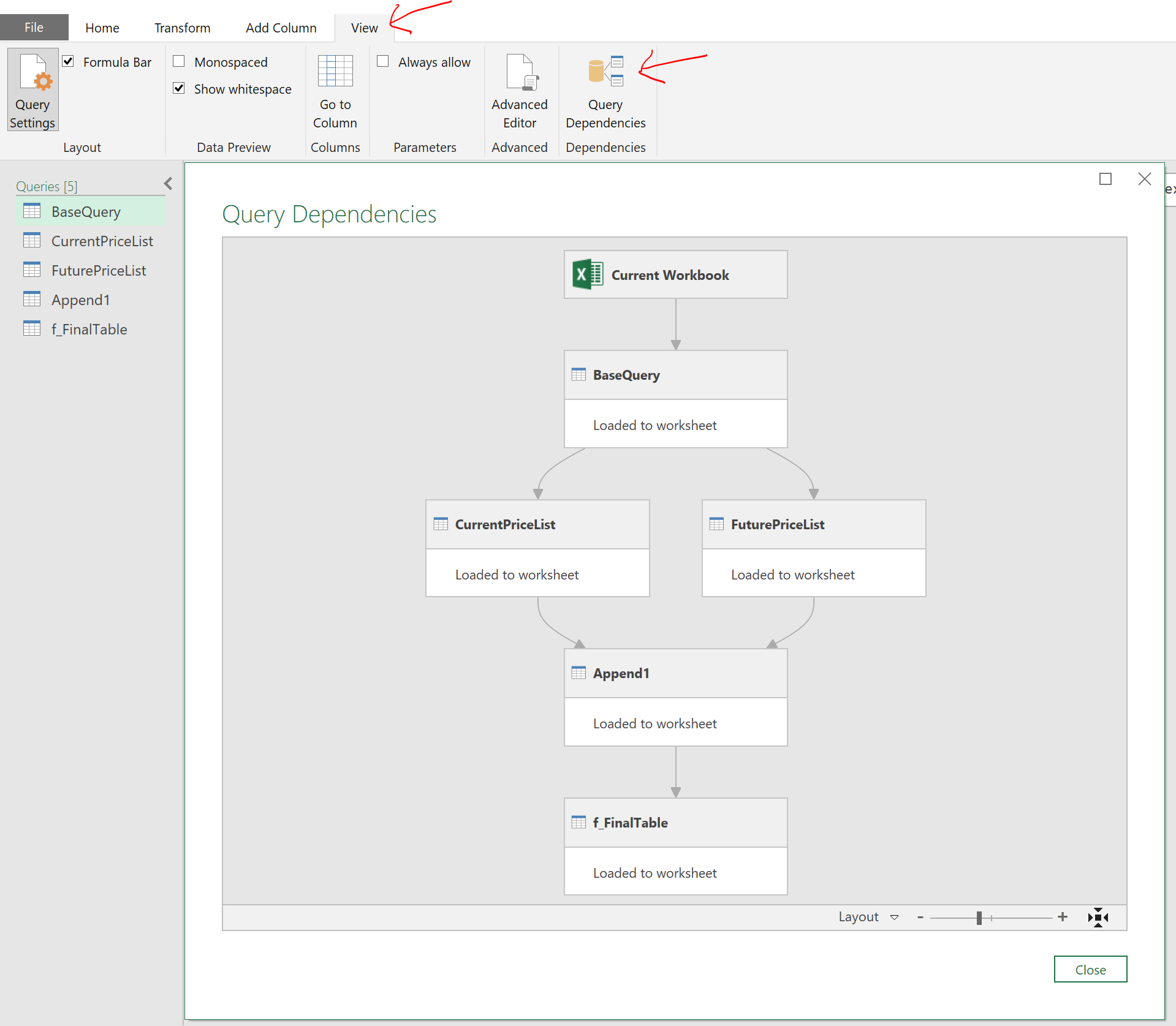 Each query created is loaded to different worksheets.  And you will see a “Workbook Queries” pane on the right.  Click on a Query to go to the table loaded: