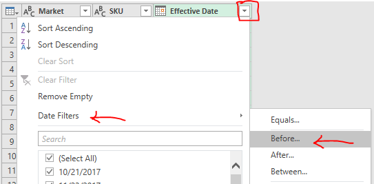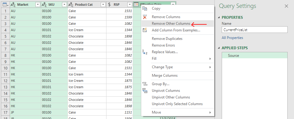 We will need three attributes (which are Market, SKU, and Effective Date) to define the price status of an item in a market, hence we can “Remove Other Columns