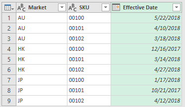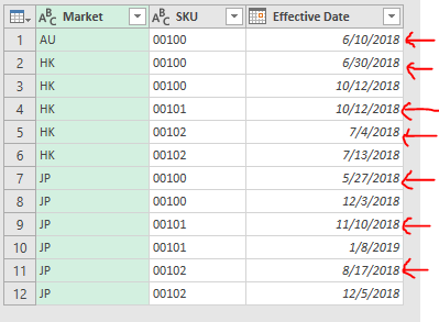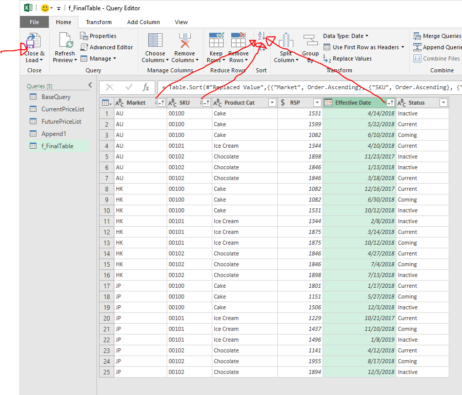 To get a better view, let’s sort the result by 1) Market, 2) SKU, 3) Effective Date.  Then click Close & Load.