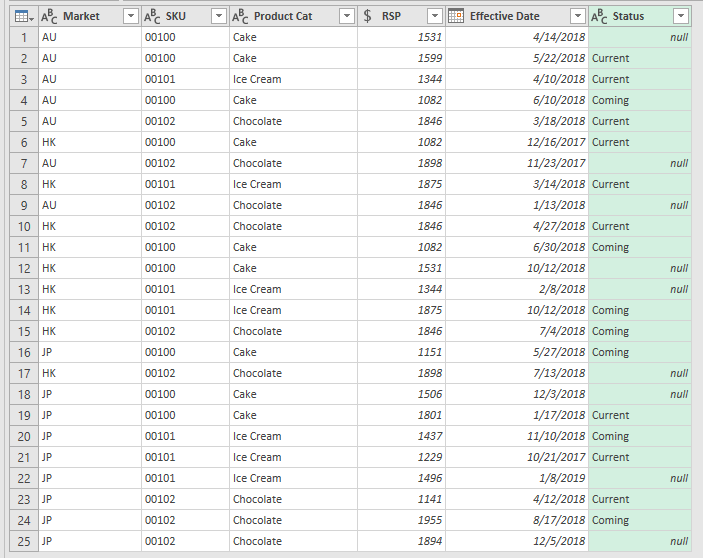 Now, examine the filtered data.  What we want is the list of items with “Current” status, which are highlighted below:Excel Tip - Price Book with PQ4.0