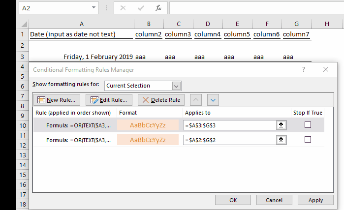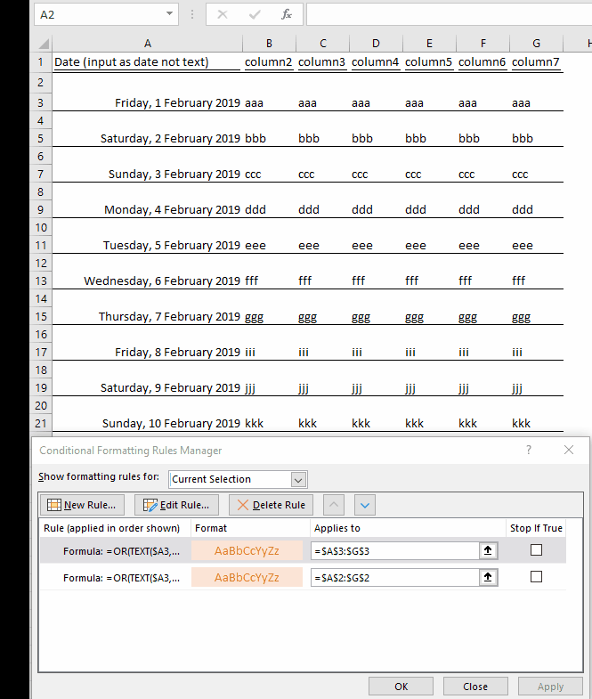 =OR(TEXT($A3,"DDD")="Sat",TEXT($A3,"DDD")="Sun") 'Applies to $A$2:$G$2 Note: Pay attention to the row we used in the formula; and the row the formula applies to. There is one row offset. =OR(TEXT($A3,"DDD")="Sat",TEXT($A3,"DDD")="Sun") 'Appleis to $A$3:$G$3