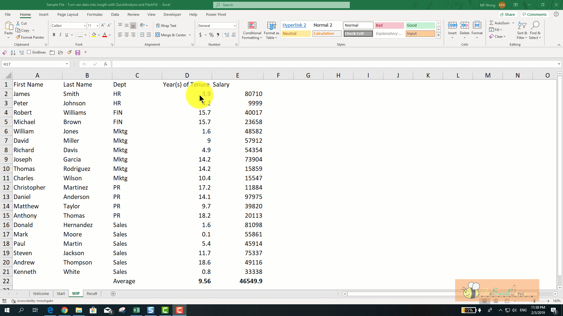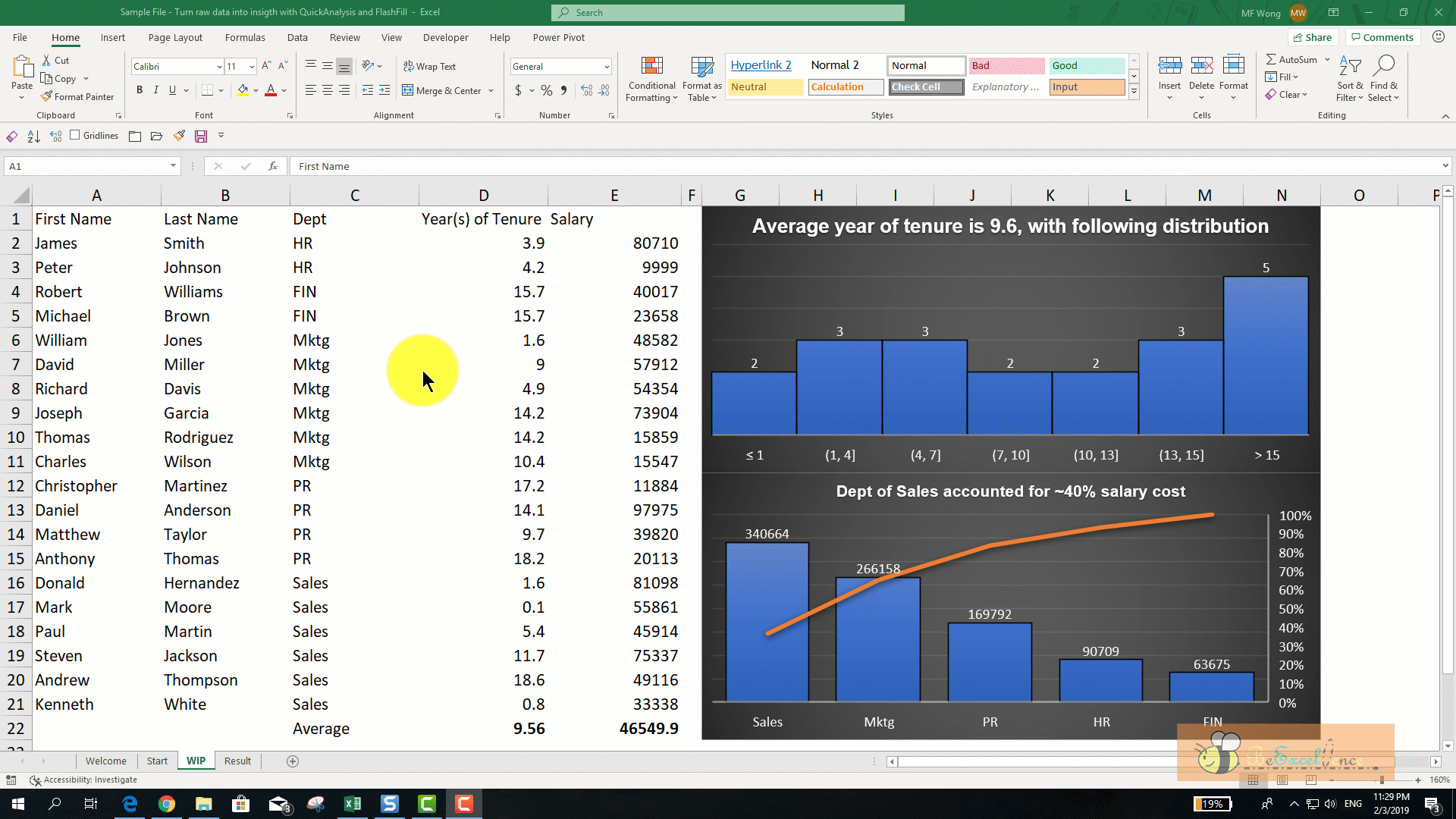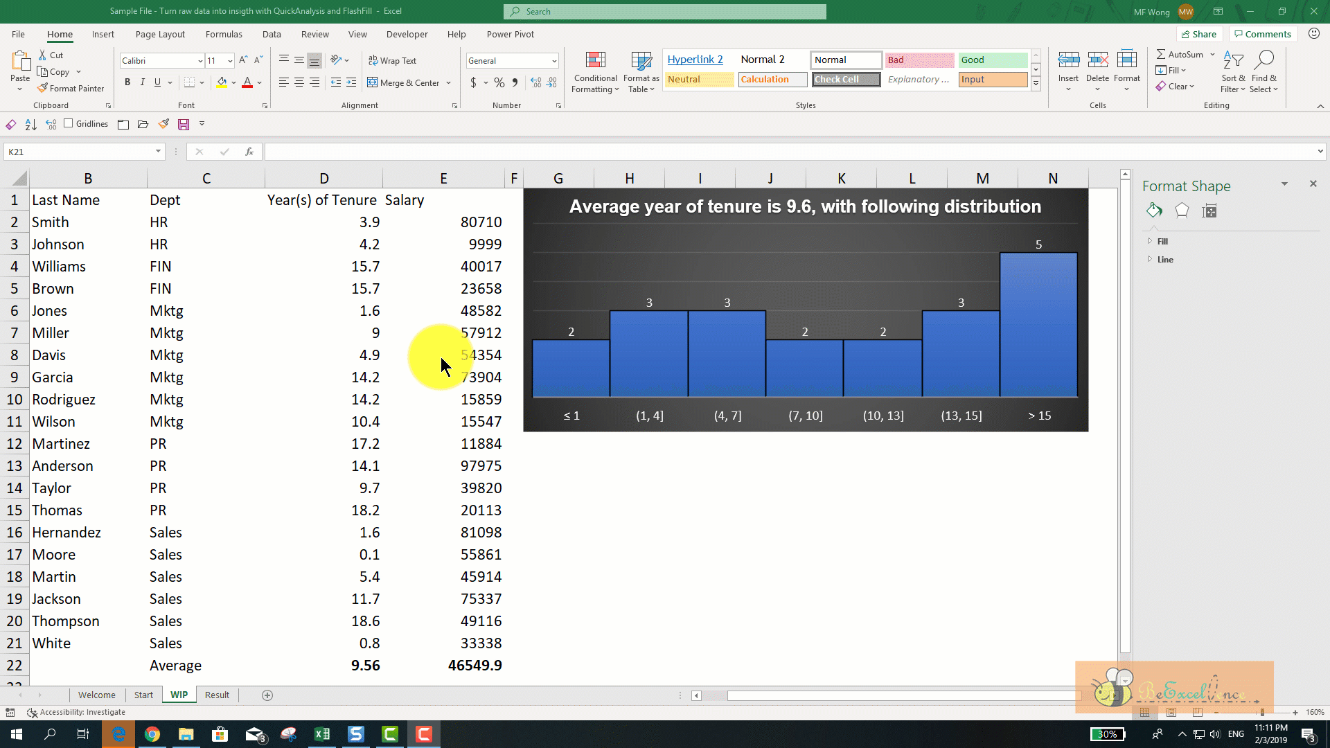 5) Final touch up using Table via Quick Analysis