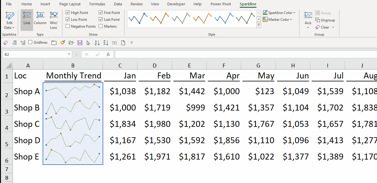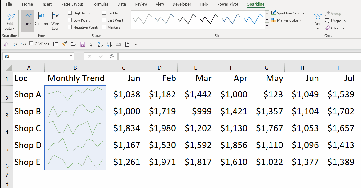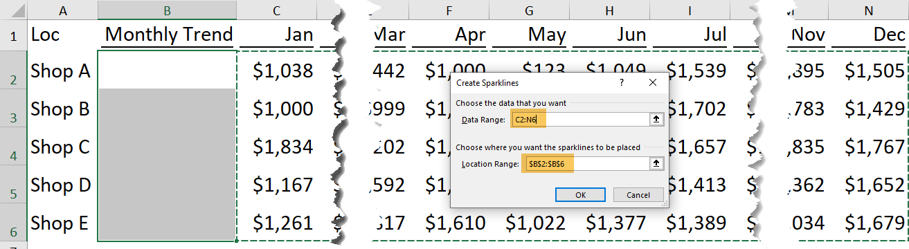 - Where you want your Sparklines to be places (the default cell reference is your current active range)
