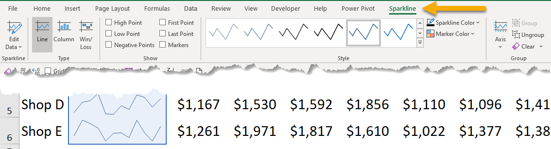 When we select a cell with Sparkline, we will see a tab of Sparkline appeared on the ribbon, where we can have more controls on the appearance of the sparklines.