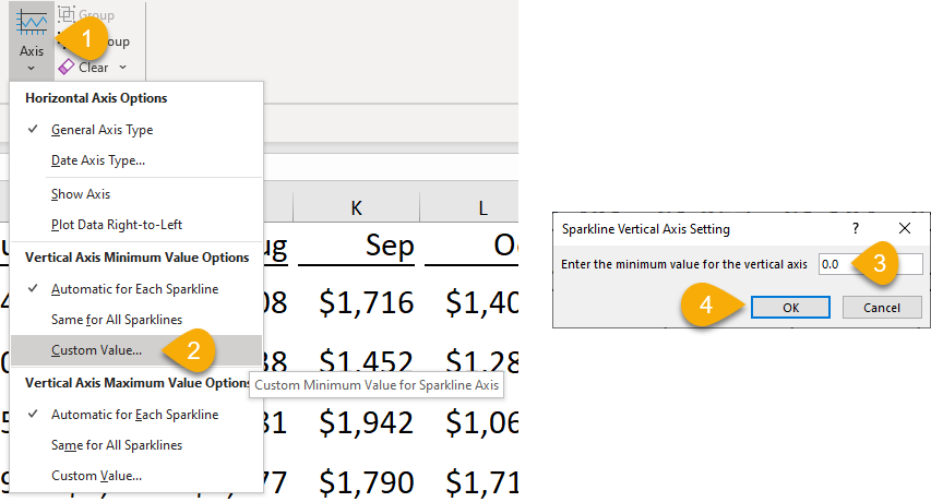 - Click the “Axis” pull-down under the Sparkline tool