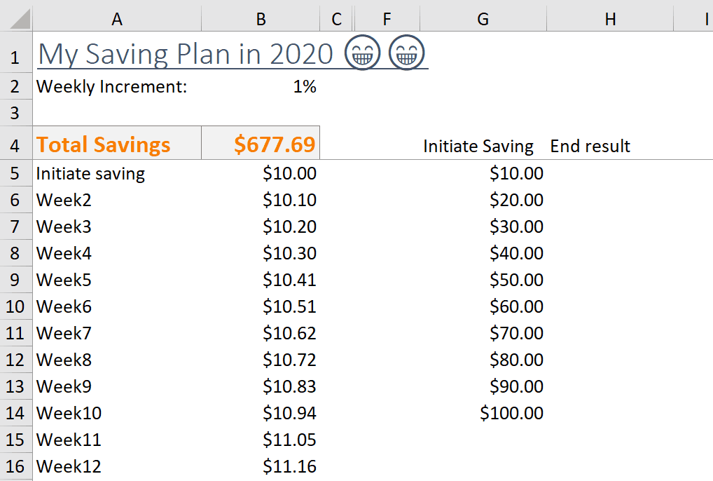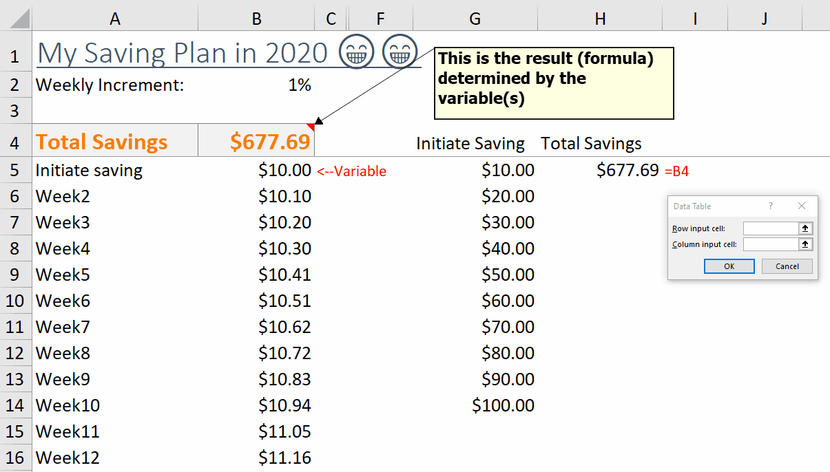 - The values pre-input in G5:G15 are the list of initiate saving (variables) that we want to examine.