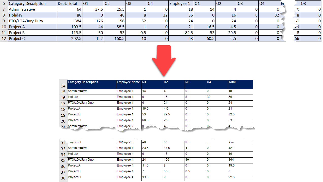 As a general rule, we should have more than one information under one column. In our dataset we now have both Employee and Quarter under the same column “Category Description” (we will rename this header later). This is no good. We need to separate Employee from this column and create an column of Employee alone.
