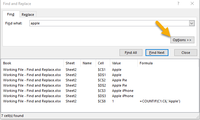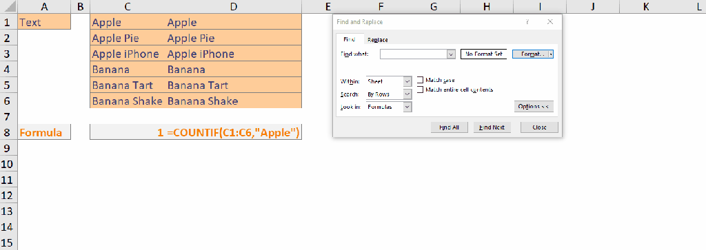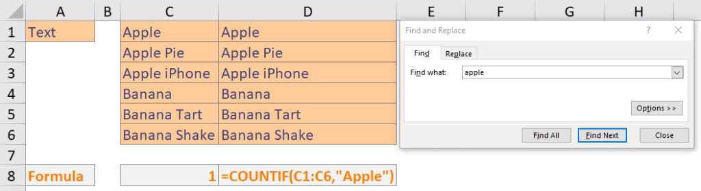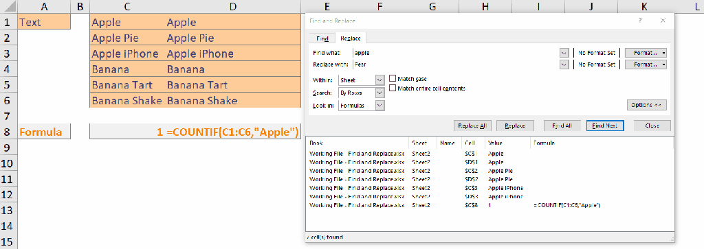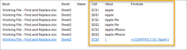 That’s why it fits the search criteria too and C8 is returned as one of the results. Pay attention to the results in the “Find” dialog box. C8 has a value of “1”, which is the result from the formula that contains the text string “apple”.