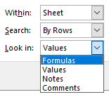 - We can look into formulas, values (the subtle difference was described above), Notes (formerly known as comment in older versions of Excel) or Comments.