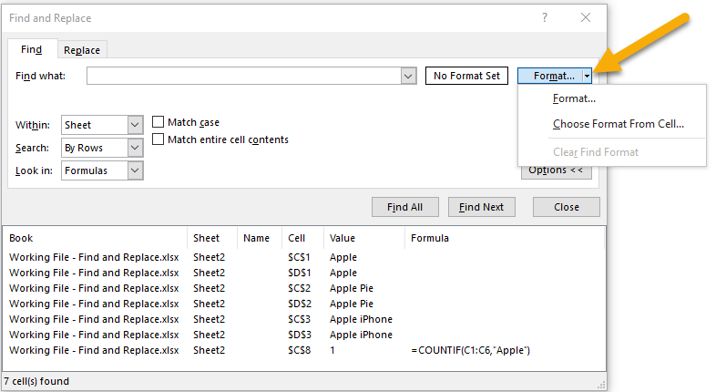 Note: I have cleared the content in the “Find what:” box (nothing there). If you have input “apple”, you are then searching cells that contains “apple” with the specific format (note: this is in effect an AND condition)