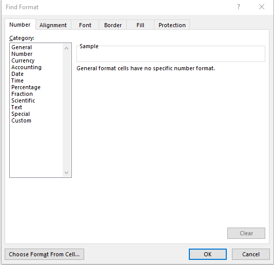 Yes!!! Of course, that’s the Cell Format dialog box. But here, we specify a format to look for. It could be easy to select a yellow filled format. However it is not at all easy to select a format we see on a worksheet. Here comes the “Choose Format From Cell…” to rescue.