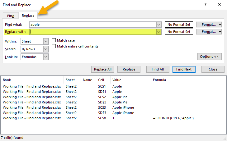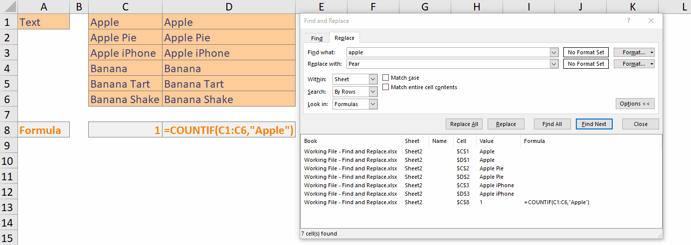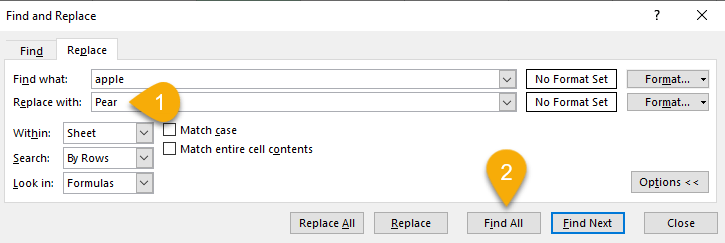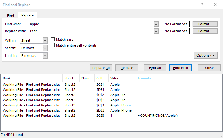By doing so, we can replace the value in selected cell(s) only. For example, replacing “apple” with “Pear” found in formulas only:
