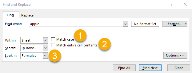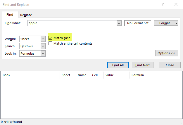 When “Match case” is checked, no cell is found with “apple” because we instructed Excel to do a case-sensitive search.