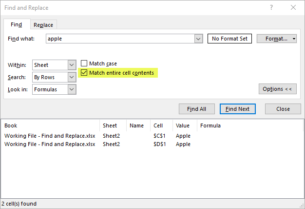 When “Match entire cell contents” is checked, only two cells (C1 and D1) are found as they fulfill the condition of “exact” match (regardless of case when the “Match case” is unchecked).