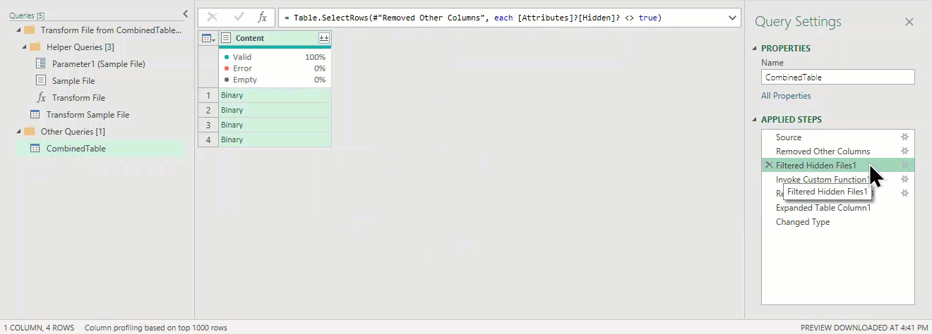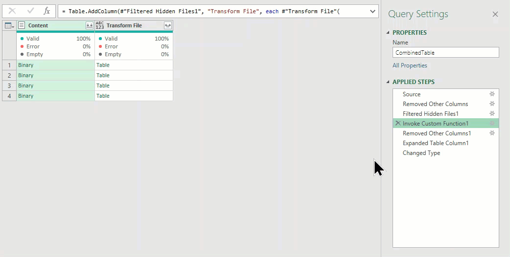 The 3rd step “Filter Hidden Files1” is added as a guard to filter out irrelevant files that may have. At this point, we have a column called “Content” with four rows. Each row contains a “Binary” file. These are the xlsx files we want to combine.