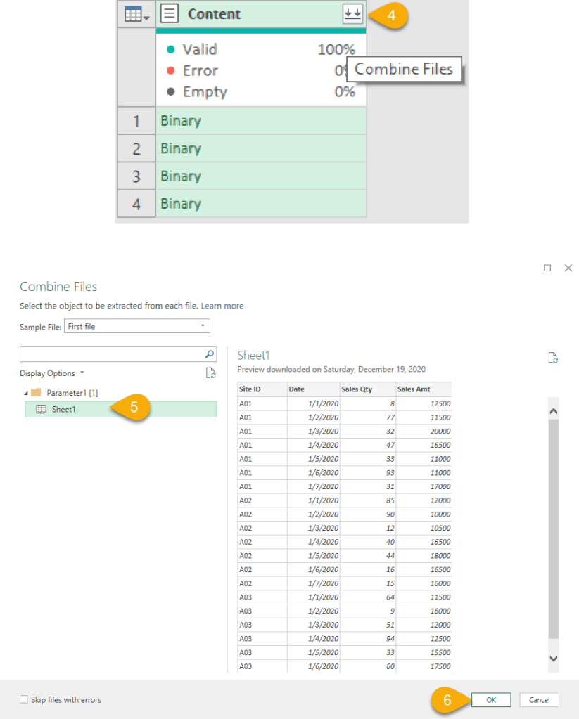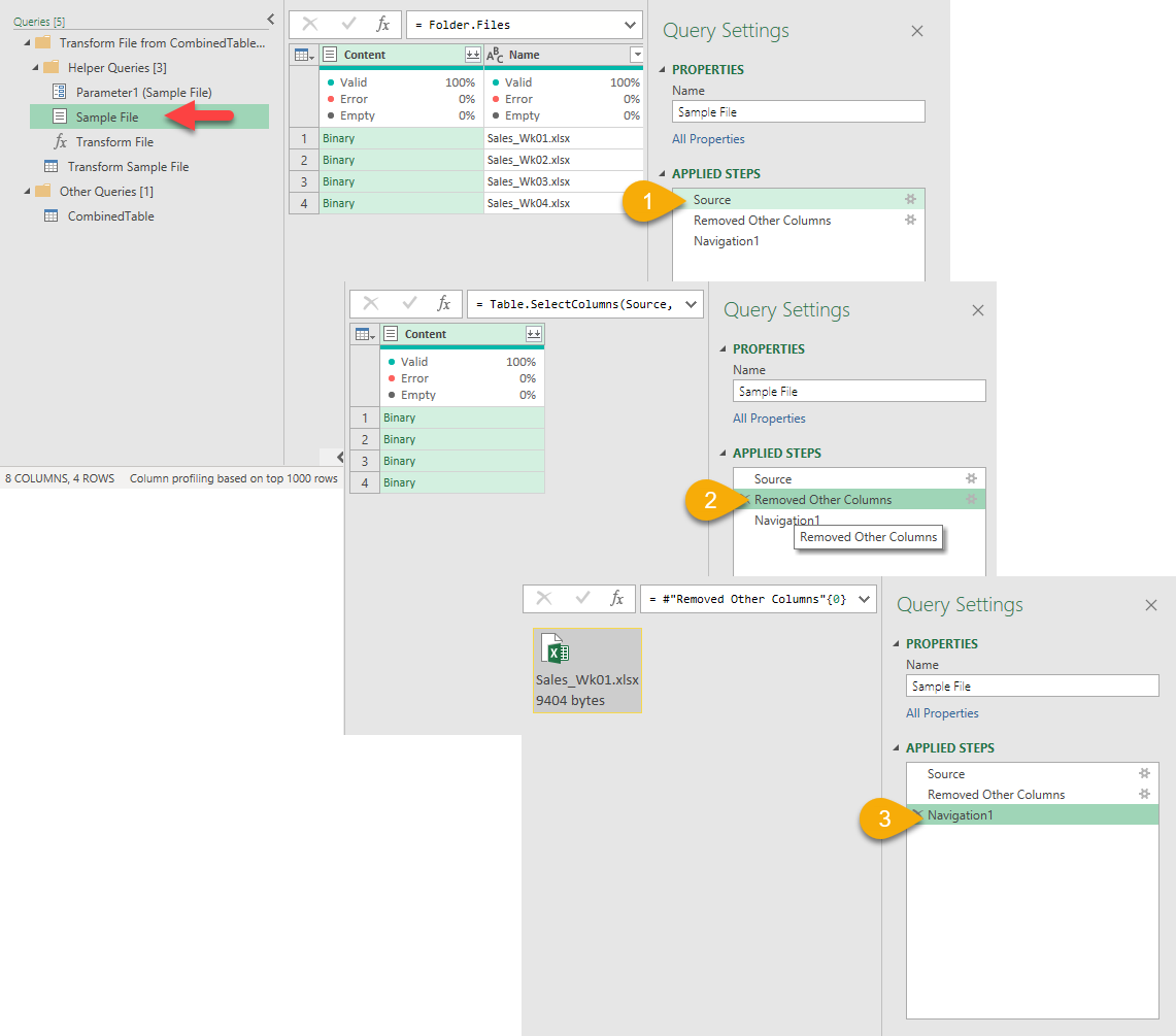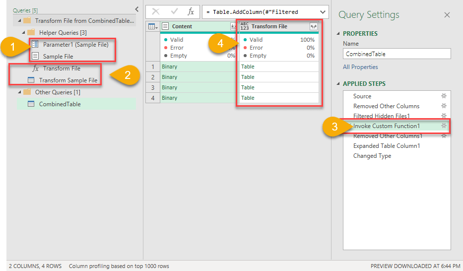 Hey Power Query, please apply all the transformation steps we did in the “Transform Sample File” query to the Excel (Binary) files listed in the Column “Content”.
