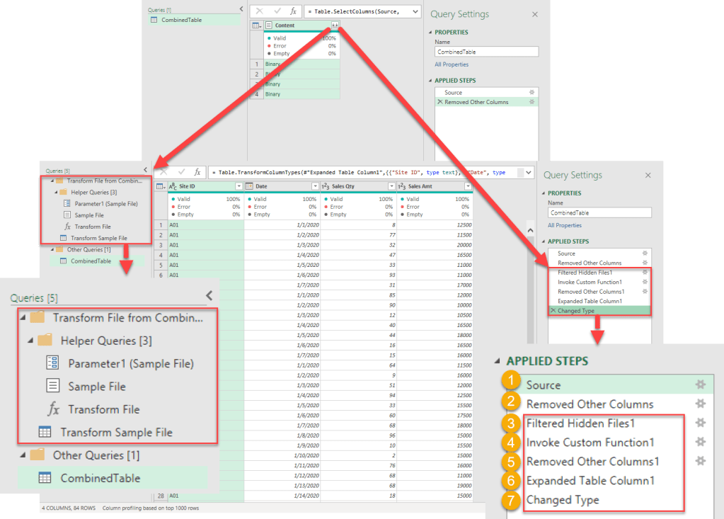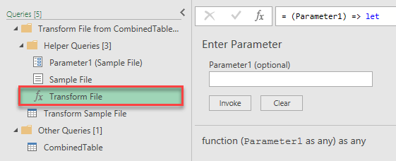 Power Query then converts all the steps in the “Transform Sample File” query into a function ==> fx Transform File which will be used in the “CombinedTable” query where we started from.