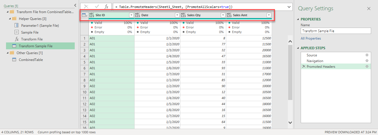 Now we are ready to look at the “final” step under “Transform Sample File“. The “final” step that was generated by Power Query automatically is “Promoted Headers“.