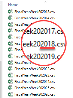 I have a list of files stored in a folder. All files are generated automatically with the same filename convention: “FiscalYearWeekyyyyww.csv”, where yyyy = year; ww = week. The file started from week 01 of fiscal year 2018, all the way to the latest week. The latest file, say, is “FiscalYearWeek202105.csv”.