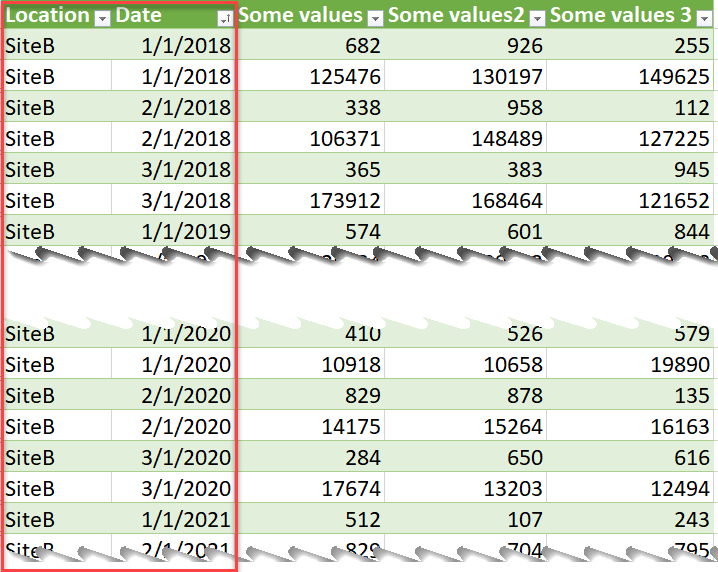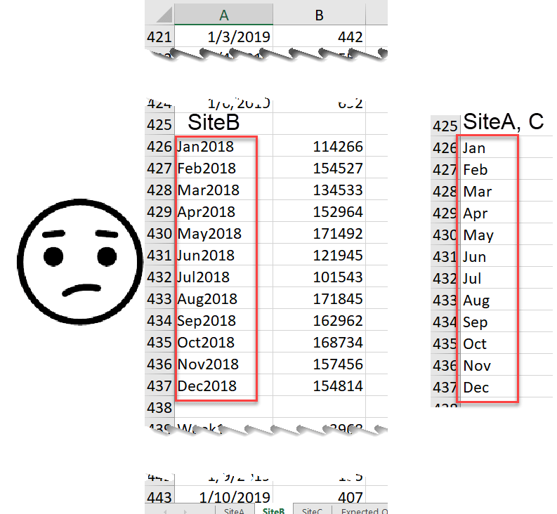 Somehow, the row headers for the monthly totals are different on this sh*t. In other sh*ts, these are only month names, with no year associated to it. But for SiteB, a four-digit year numbers were added to the month names.
