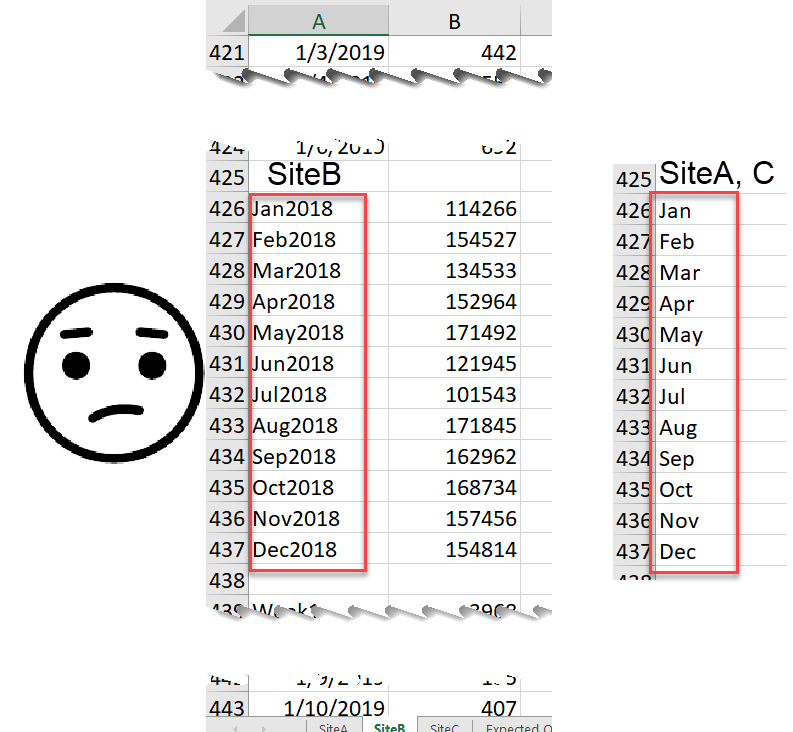 Because of this slight inconsistence in data, my original query plan didn’t work for the entire dataset. It worked just for SiteA and Site C, but not for Site B. (Again, this is a simplified version. In real case, there are many more worksheets in multiple workbooks)