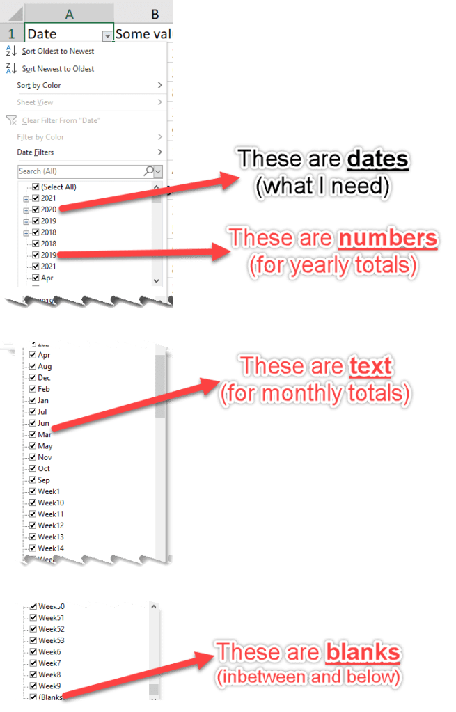 The presence of numbers in column A breaks the pattern. These numbers will be converted into “date” when I set the data type to “Date“.