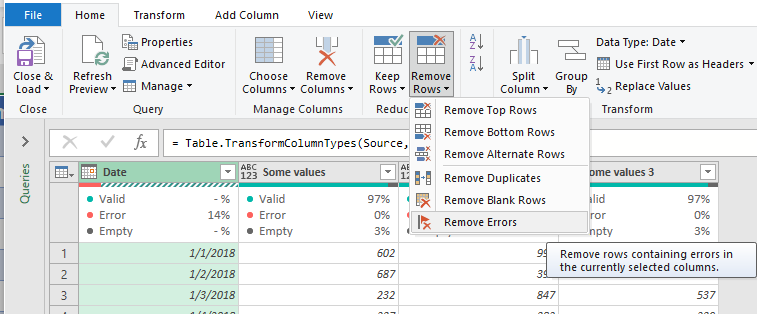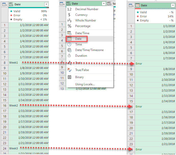 When I defined data type in a column in Power Query Editor, I’d got “Error” when Power Query failed to convert the data into the data type specified. In our example above, “Text” could not be converted to “Date“. As a result, “Error” was returned, which I could remove them easily afterward.
