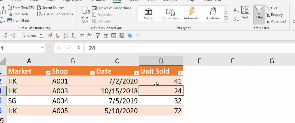 However, filter is not dynamic. In order to filter out the record of A004, which we have just revised it to SG Market, we have to reapply the filter again.