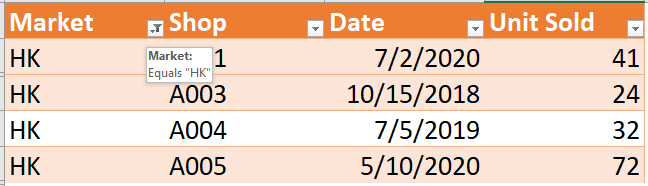 We have applied a filter on Market to show records of “HK” only, as shown below: