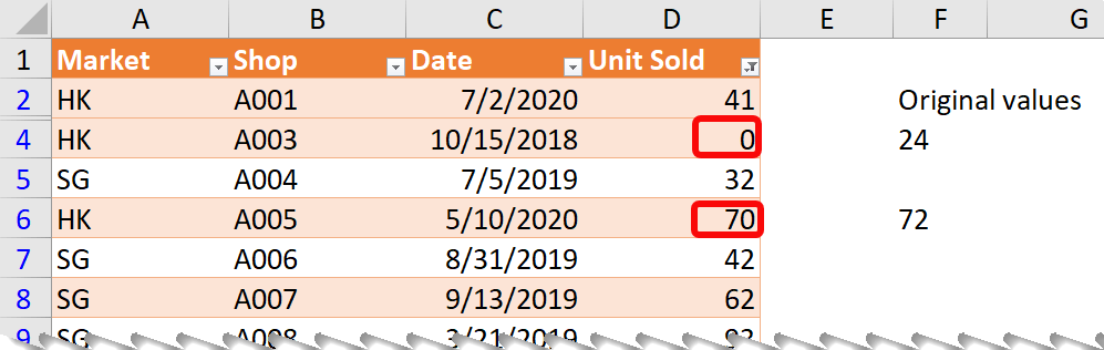 Let’s say, we have revised two values from 24 to 0 in D4, and from 72 to 70 in D6, as shown below: