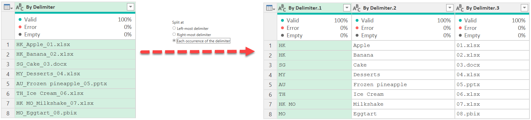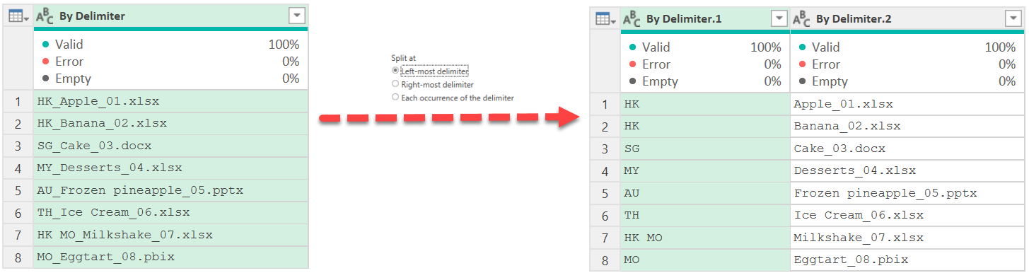The first option we have is “By Delimiter”. As the name suggests, we can splits a text column into multiple columns by delimiter. As you see from the screenshot below, we can select common delimiters from the pulldown menu, or select –Custom– and input a custom delimiter which could be a symbol, or letter, number, even a text string.