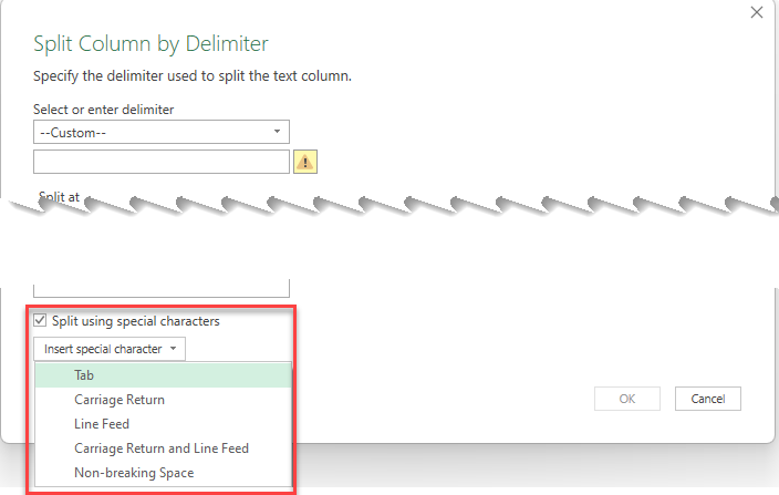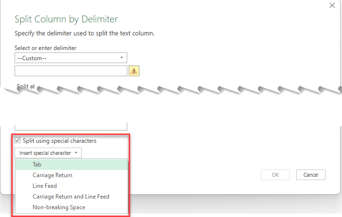 Last but not least, Power Query offers a list of “special characters” when we select “–Custom–” as delimiter. It is super handy as it’s not easy for a regular user to know the code for Tab, Line Feed, etc. 👍