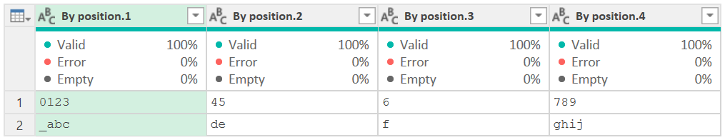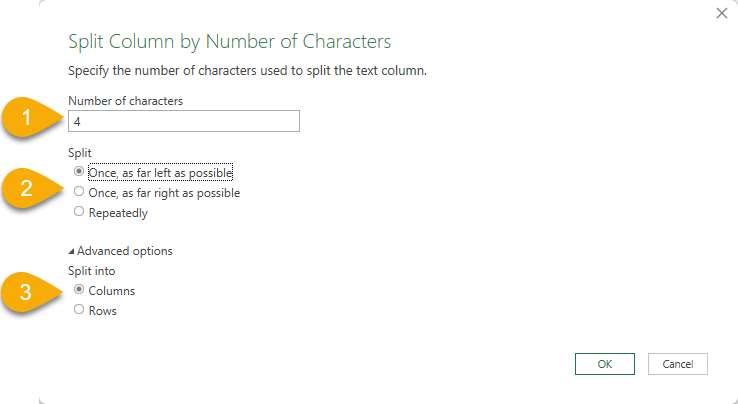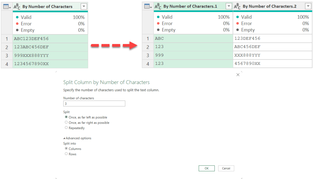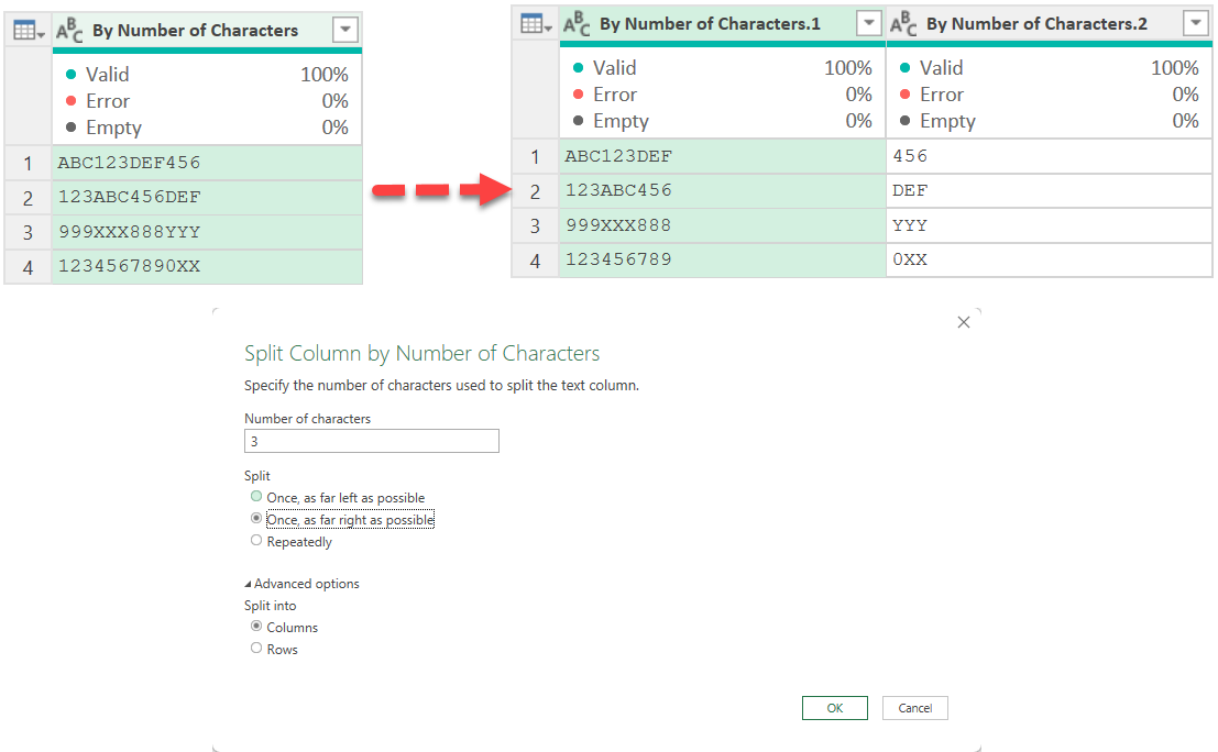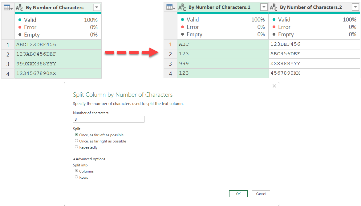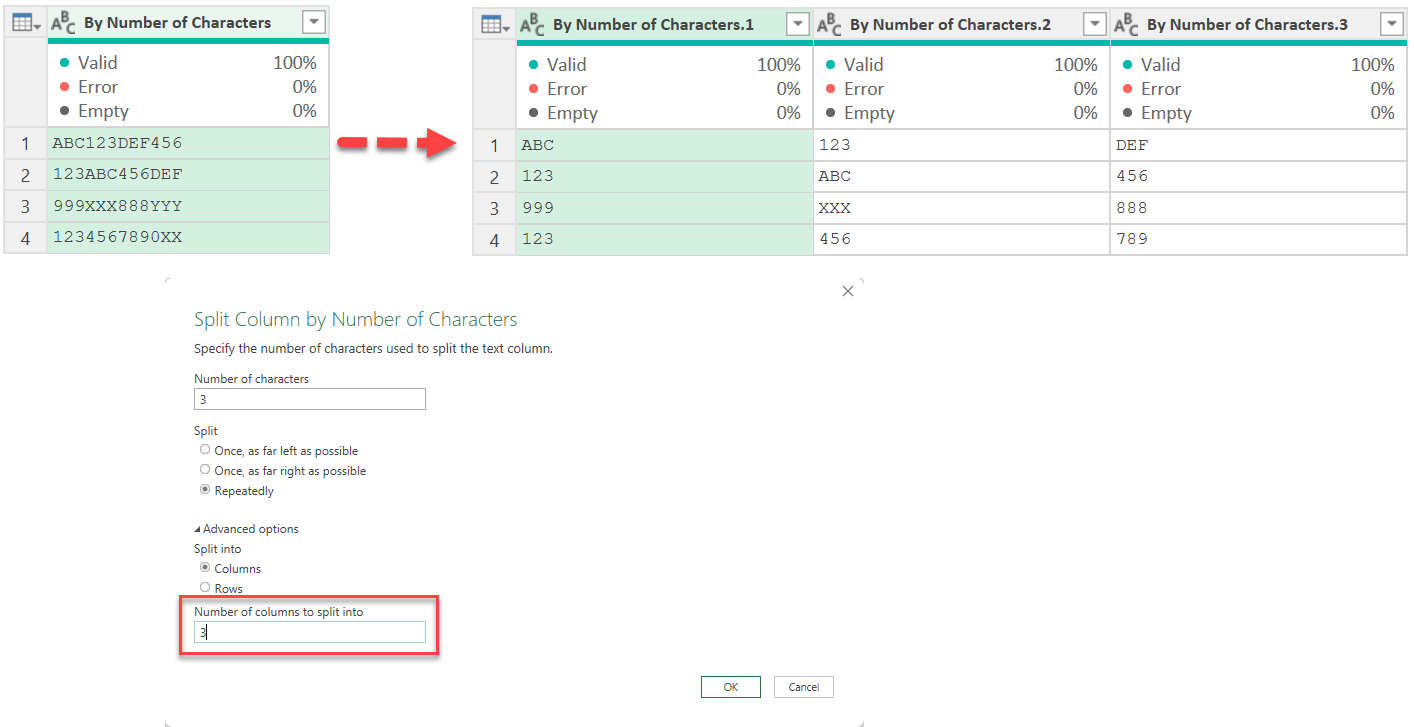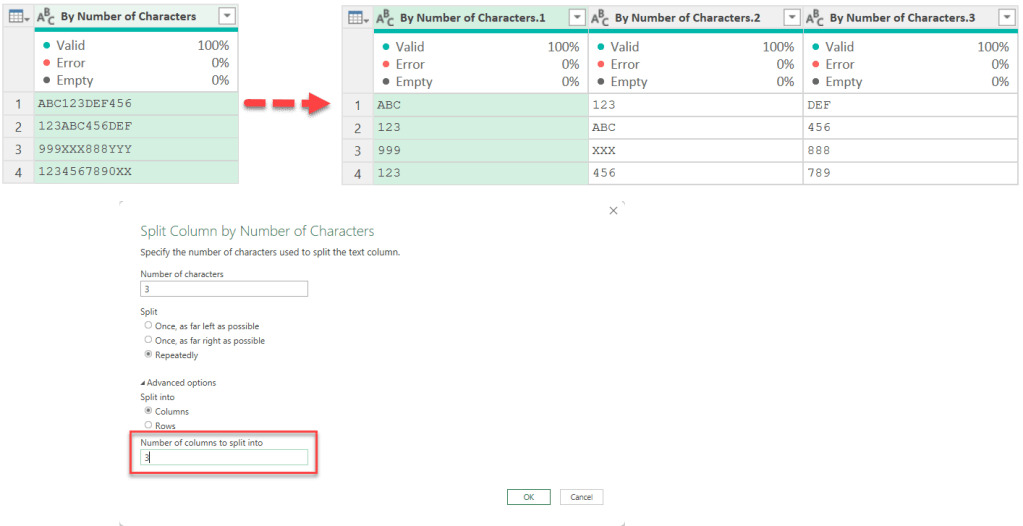With this option, Power Query will input the fourth parameters – Number of columns to split into, for us. It assumes (based on the sample data loaded into it) that you want to split all the way till the end. In our example below, the max length of text is 12. To split it by 3 characters, we will have 4 columns as a result.