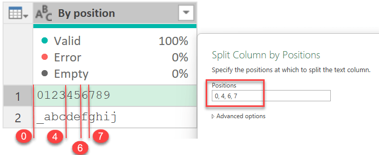Let’s say we try to split by at positions 0, 4, 6, 7. The screenshot below visualizes what it means by position.