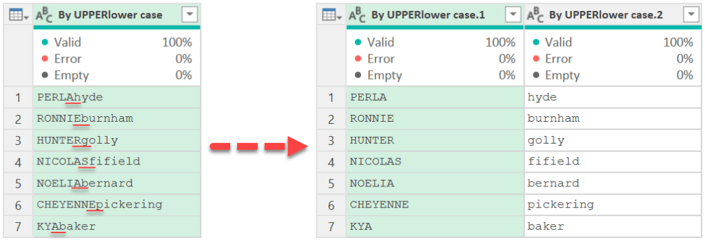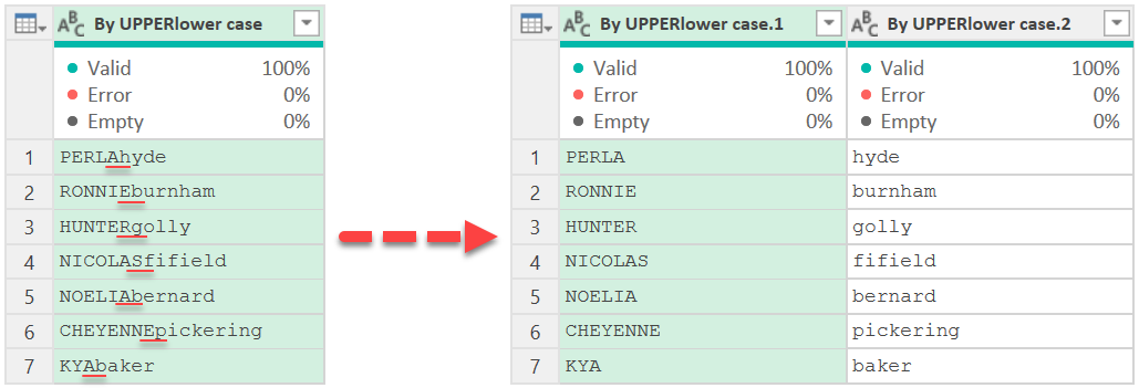 Honestly, I haven’t met a case I need to split text with this case transition. I make up the following example by having last name in UPPERCASE while first name in lower case. The point here is to illustrate the splitting point and the result.