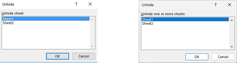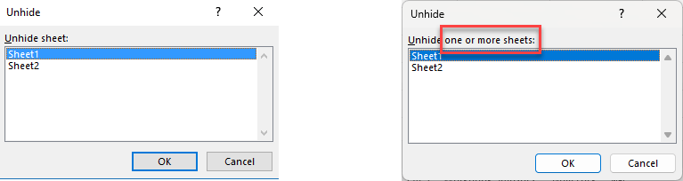 So, do we have alternative ways to unhide multiple ways with older versions of Excel? Well… we may use VBA to hide selected sheets. However, there is no easy way to unhide multiple sheets, although we may unhide all hidden sheets at once. Read the following post for more details: