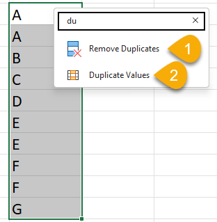 What I want to do is to remove duplicates in the selected range. Let’s say I am not familiar with Excel. I have no idea how to deal with duplicates. That makes my first attempt to input the word “duplicates” in the search box. As long as I type “du”, I’ve got this: