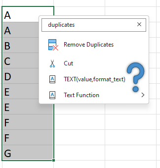 This is awesome! Excel suggests relevant actions to me when I start typing in the “Search the menus” box. However, it’s not perfect yet. It gives me irrelevant suggestions when I type the whole word “duplicates”: